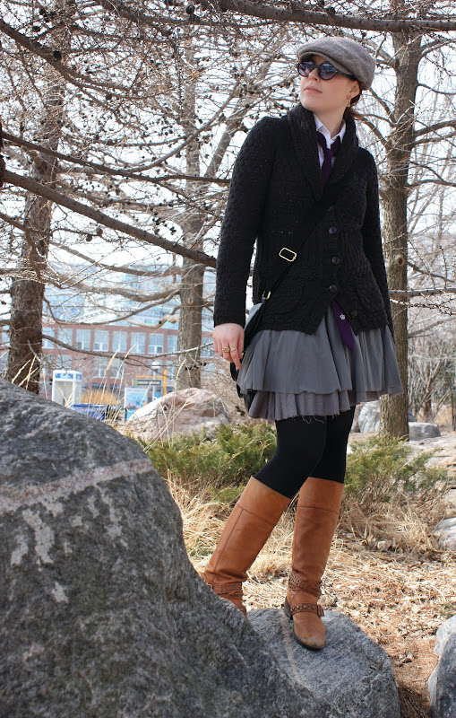 What a beautifully put-together outfit........loving everything in it right from the pageboy cap & the tie to the skirt & the boots! :)